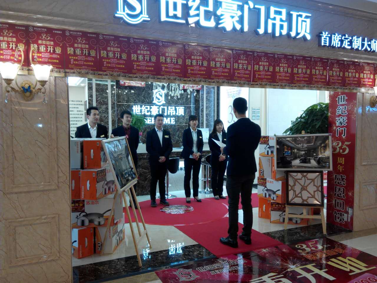 世紀豪門頂墻一體長沙店,位于長沙市喜盈門·范城,3樓3號電梯口,180余平米的終端面積,是該區域不可多得的明星店面。30天快速裝修,早在店面設計裝修過程中,長沙世紀豪門就已招兵買馬,陸續建立好了設計師、店長、業務經理、導購員、售后安裝工為主體的運營團隊;試營業以來石材背景,吊頂接單都給力!