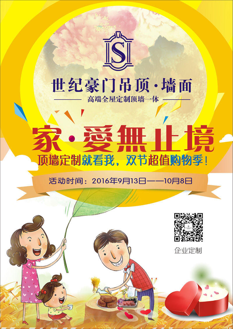世紀豪門中秋、國慶雙節活動——“家·愛無止境”,頂墻定制就看我,雙節超值購物季!