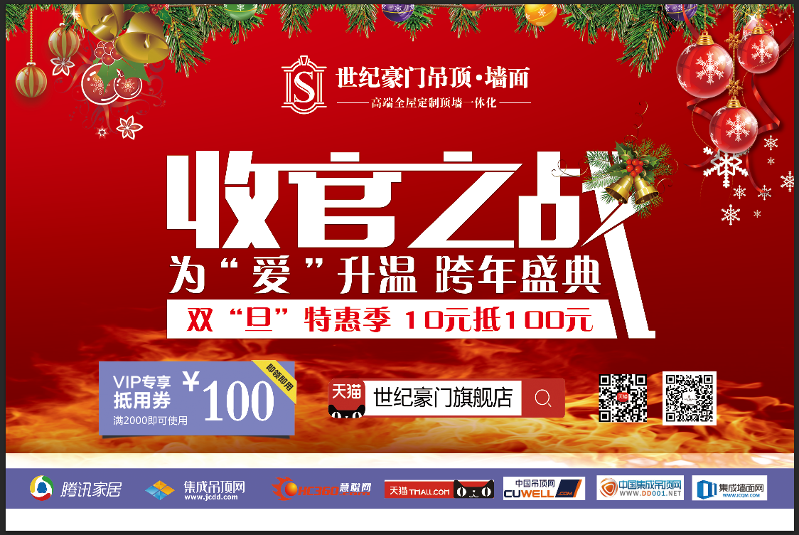 活動期間,所有客戶關注收藏世紀豪門頂墻一體化天貓官方旗艦店,拍得10元天貓電子抵用券可抵100元。