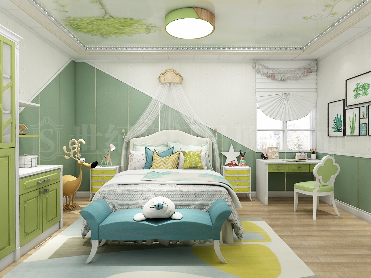 綠白相間的兒童房有非常清新自然,加上軟裝藍(lán)色的點(diǎn)綴,就組成了一個(gè)舒適的空間。我想要的兒童房就是這個(gè)樣子,不用太過(guò)豐富的色彩與太過(guò)復(fù)雜的擺設(shè),入目簡(jiǎn)單清爽就很好。
